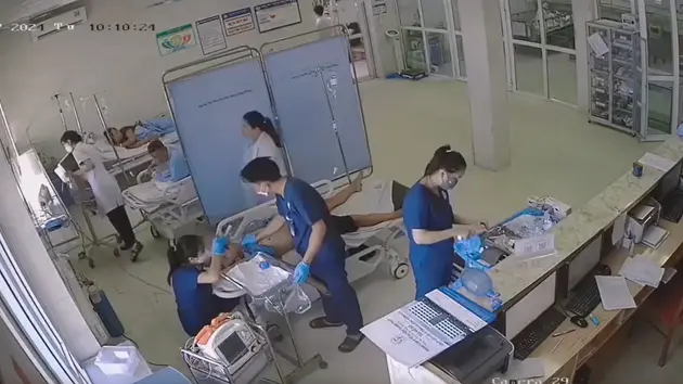 Trước tình huống bệnh nhân trong cơn nguy kịch, hai bác sĩ và điều dưỡng Tân đã mau chóng ép tim ngoài lồng ngực cho bệnh nhân.