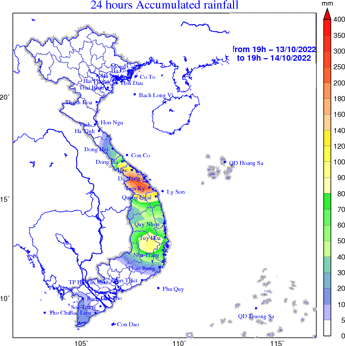 Do ảnh hưởng của áp thấp nhiệt đới trên Biển Đông kết hợp với không khí lạnh, khu vực Quảng Bình đến Bình Định, Tây Nguyên bước vào đợt mưa lớn diện rộng từ đêm 13/10, đợt mưa này khả năng kéo dài.