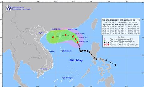 Dự báo, đến 16 giờ ngày 1/11, vị trí tâm bão ở vào khoảng 19,5 độ Vĩ Bắc - 115,7 độ Kinh Đông, cách quần đảo Hoàng Sa khoảng 560 km về phía Đông Bắc. Bão di chuyển theo hướng Bắc Tây Bắc, mỗi giờ đi được 10 km, sức gió mạnh nhất vùng gần tâm bão mạnh cấp 11-12, giật cấp 14. Vùng nguy hiểm trên Biển Đông trong 12 giờ tới là vĩ tuyến 16,0 - 23,0 độ Vĩ Bắc, 113,0 - 118,0 độ Kinh Đông. Vùng biển phía Đông khu vực Bắc và giữa Biển Đông chịu rủi ro thiên tai cấp 3.