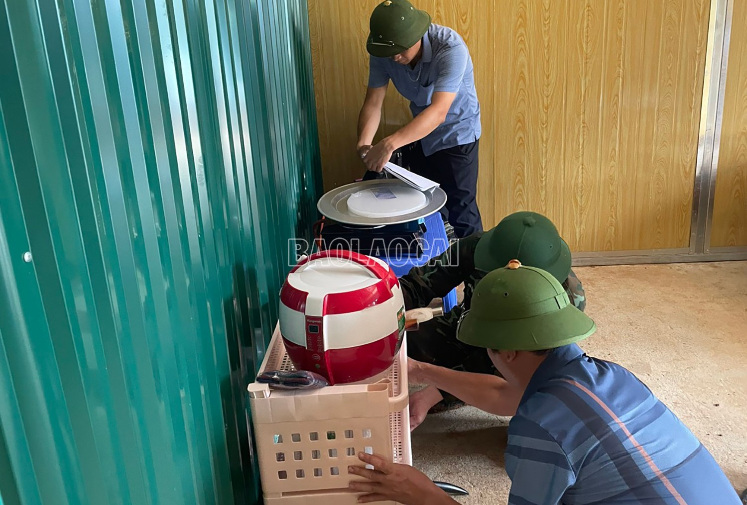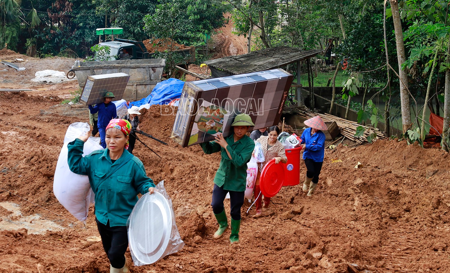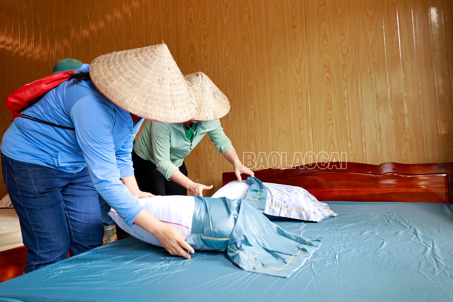 Sắp xếp các vật dụng sinh hoạt cho các hộ dân. Ảnh: Báo Lào Cai