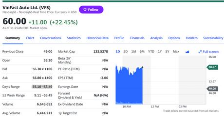 Mở đầu phiên giao dịch ngày 25/8 tại Mỹ, cổ phiếu VFS giao dịch ở mức giá 63,49USD/cp, tăng gần 30% so với giá đóng cửa phiên trước đó.