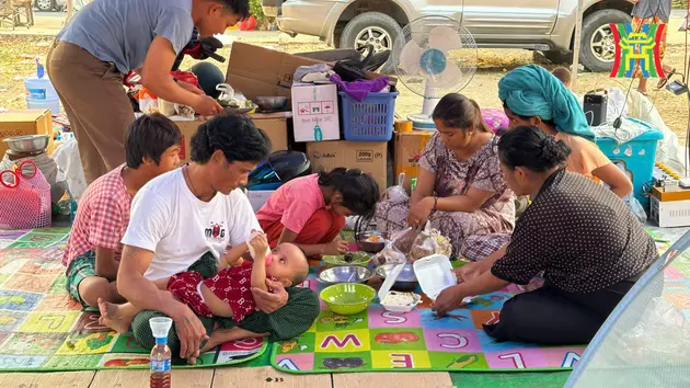Điểm đến đầu tiên của nhóm phóng viên là chợ Mingalar, nơi tá túc tạm thời của những người dân mất nhà cửa sau trận động đất hôm 28/3. Các lều được trang bị pin mặt trời, một số vật dụng và đồ ăn, nước uống. Toàn bộ nhu yếu phẩm do chính phủ và các nhà hảo tâm hỗ trợ. Lúc 7 giờ sáng, những người có công việc đã đi làm, tại các lều chỉ còn trẻ em, phụ nữ và người lớn tuổi.