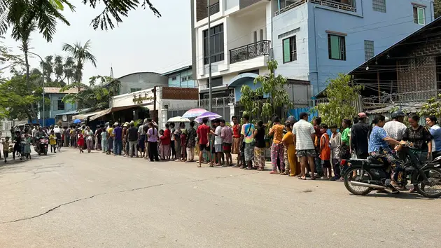 Hàng dài người dân tại thành phố Mandalay xếp hàng dưới nắng nóng để chờ được tiếp tế nước sạch và thực phẩm. Ghi nhận của phóng viên Đài Hà Nội từ Myanmar.