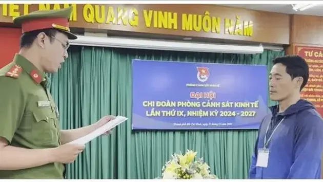 Công an đọc lệnh khởi tố đối với bị can trong đường dây mua bán trái phép hóa đơn. Ảnh: TTXVN.