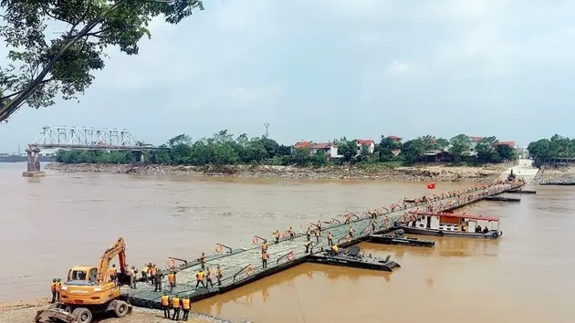 Công an tỉnh Phú Thọ thông tin, từ 14 giờ hôm nay 4/10, người đi bộ, xe thô sơ, xe gắn máy, các loại mô tô có thể qua khu vực cầu Phong Châu bằng phà quân đội.