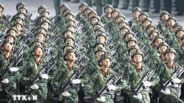 Các lực lượng tham gia diễn binh, diễu hành trong Lễ kỷ niệm 50 năm Giải phóng miền Nam, thống nhất đất nước tiến hành Tổng hợp luyện lần thứ hai trong tối 22/4, tại trục đường Lê Duẩn, TP Hồ Chí Minh.