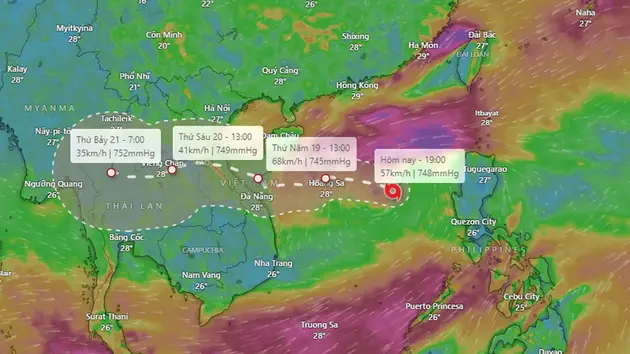 Đến 16 giờ ngày 19/9, vị trí tâm bão ở vào khoảng 16,8 độ Vĩ Bắc, 108,9 độ Kinh Đông, cách đất liền các tỉnh Quảng Bình đến Đà Nẵng khoảng 200 km về phía Đông Đông Nam. Sức gió mạnh nhất vùng gần tâm bão mạnh cấp 8 - 9, giật cấp 11. Bão di chuyển theo hướng Tây Tây Nam với tốc độ 15 - 20 km/giờ.