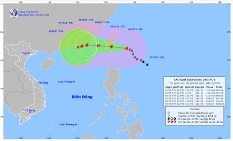 Theo Trung tâm Dự báo Khí tượng Thủy văn Quốc gia, đến 7h sáng nay (04/10), vị trí tâm bão Koinu ở vào khoảng 22,1 độ Vĩ Bắc; 123,7 độ Kinh Đông, trên vùng biển phía đông nam đảo Đài Loan (Trung Quốc), cách phía nam đảo Đài Loan khoảng 300km về phía đông đông nam.