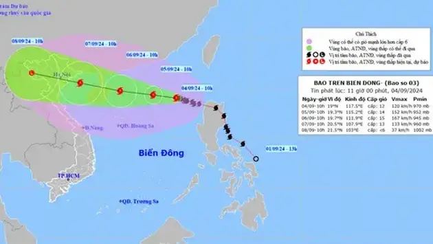 Từ ngày 5 - 6/9, bão số 3 tiếp tục tăng cường độ, gió mạnh có thể đạt tới cấp 15, giật trên cấp 17 ở vùng gần tâm bão.