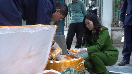 Theo đó, lực lượng chức năng đã tiến hành kiểm tra đột xuất xe tải mang BKS 29H -17814 đang dừng đỗ tại trước số nhà 50 ngõ 28 Xuân La, phường Xuân La, quận Tây Hồ. Tại thời điểm kiểm tra, lái xe không xuất trình được bất kì hóa đơn chứng từ liên quan đến nguồn gốc số nội tạng động vật trên xe. Số nội tạng động vật bao gồm nầm lợn, trứng non đông lạnh được cất giữ trong các thùng xốp, bên ngoài các thùng xốp này đều có chữ nước ngoài.