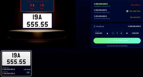 Đúng 9 giờ, biển số 19A-555.55 là biển số đầu tiên bắt đầu chào sàn. Sau hơn 30 phút, mức giá cao nhất trả cho biển số này được trả gần 2,6 tỉ đồng. Tới 10 giờ sáng nay mới "gõ búa" chốt giá biển số "VIP" này.