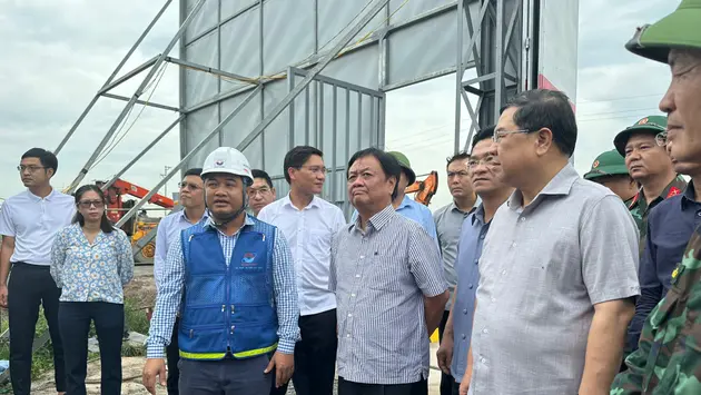 Tại khu nhà xưởng đang xây dựng, Bộ trưởng lưu ý chủ đầu tư, phải khẩn trương hoàn thiện công đoạn cuối về phòng chống bão, đảm bảo an toàn công trình, tuyệt đối cấm công nhân ra vào khu vực thi công.