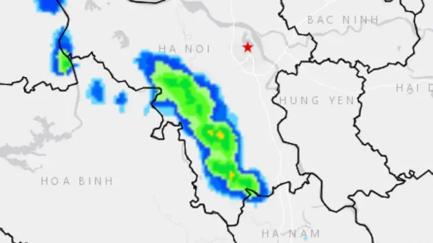 Vùng mây đối lưu gây mưa đang hoạt động tại một số huyện ngoại thành Hà Nội; trong khoảng 3 giờ tới, vùng mây này sẽ gây mưa và có thể có dông cho các quận Hà Đông, Thanh Xuân, Hoàng Mai...