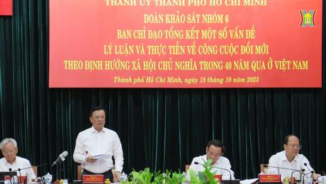Sáng nay 18/10 , đoàn khảo sát nhóm 6 - Ban Chỉ đạo tổng kết Trung ương do Uỷ viên Bộ Chính trị, Bí thư Thành uỷ Hà Nội Đinh Tiến Dũng, Phó trưởng nhóm 6 làm Trưởng đoàn làm việc với Thành uỷ Thành phố Hồ Chí Minh về một số vấn đề lý luận và thực tiễn về công cuộc đổi mới theo định hướng XHCN trong 40 năm qua trên địa bàn.