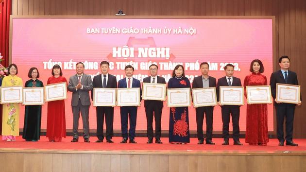 Trong suốt 75 năm xây dựng và trưởng thành, trải qua nhiều giai đoạn lịch sử từ thời chiến đến thời bình, đội ngũ những người làm tuyên giáo Thủ đô đã làm tốt công tác tư tưởng, tuyên giáo, đóng góp quan trọng vào thành công chung của thành phố và cả nước. Với bề dày thành tích của 75 năm nỗ lực phấn đấu và trưởng thành, Ban Tuyên giáo Thành ủy Hà Nội đã được tặng thưởng Huân chương Hồ Chí Minh, Huân chương Độc lập hạng Nhất, Huân chương Lao động hạng Ba và nhiều phần thưởng cao quý khác của Đảng, Nhà nước, thành phố trao tặng.