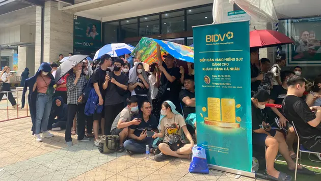 Tại các điểm giao dịch của Vietinbank và BIDV trên phố Bà Triệu và phố Huế, vẫn còn hàng trăm người đội nắng xếp hàng chờ mua vàng. Các điểm giao dịch này thông báo cung cấp 100 số thứ tự mua vàng trong sáng nay. Mỗi người dân chỉ được mua tối đa 1 lượng.