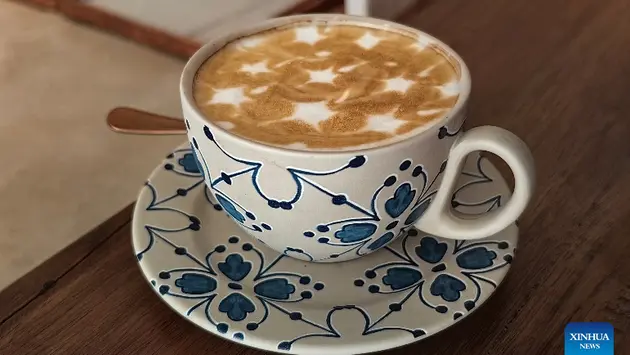 Ảnh chụp một tách "cà phê mưa sao băng" do Li Qian pha chế tại một khách sạn ở Trung Vệ, Khu tự trị dân tộc Hồi Ninh Hạ, tây bắc Trung Quốc.