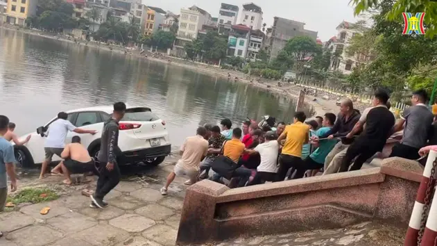 Hàng chục người dân hỗ trợ kéo ô tô lao xuống hồ