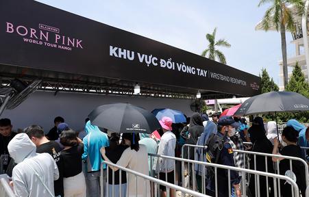 Dù thời tiết nắng nóng, nhiều người hâm mộ vẫn vui vẻ đến SVĐ Mỹ Đình để đổi vé điện tử thành vòng tay tham gia concert BlackPink.