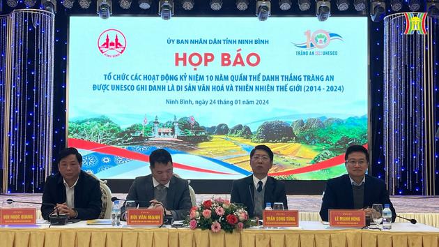 Sáng nay (24/1) tại tỉnh Ninh Bình, đã diễn ra cuộc họp báo về việc tổ chức Lễ kỷ niệm 10 năm Quần thể danh thắng Tràng An được Unesco ghi danh là di sản văn hóa và thiên nhiên thế giới. Lễ kỷ niệm nhằm tôn vinh các thành tựu, những đóng góp của các tổ chức và cá nhân trong việc quản lý, bảo tồn và phát huy các giá trị của Di sản văn hóa và thiên nhiên thế giới,