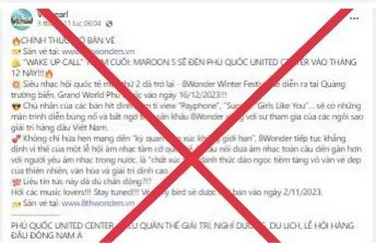 Theo Công an TP Hà Nội, hiện nay trên không gian mạng xuất hiện các trang web, fanpage mạo danh tập đoàn Vingroup như: www.facebook.com/ vinpearlrnew, www.8thwonders.vn, www.8thwondesr.com... đăng tải các bài viết quảng cáo bán vé tham dự chương trình Siêu nhạc hội quốc tế mùa thứ 2 - 8 Wonder Winter Festival sẽ diễn ra tại Quảng trường biển, Grand World Phú Quốc vào ngày 16/12/2023.