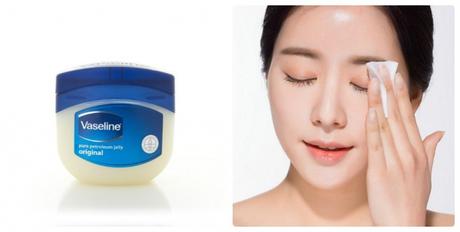 - Tẩy trang: Hầu hết các vấn đề do mỹ phẩm còn sót lại gây ra là do thành phần dầu còn sót lại trên mặt. Đặc biệt, những đồ trang điểm có màu như trang điểm mắt hay môi rất khó làm sạch nhưng sử dụng nước tẩy trang gốc dầu có thể tẩy sạch, vì vậy có thể sử dụng vaseline để tẩy trang. Ngoài ra, thoa một lớp vaseline mỏng có thể giúp tẩy tế bào da chết và chữa lành da.
