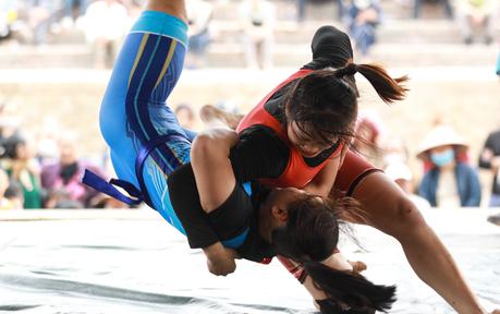 Không kém gì các nam đô vật, trên sới vật, các nữ đô vật đã thể hiện sức mạnh của mình trong từng động tác, sự quyết liệt lộ rõ trong từng miếng đánh.