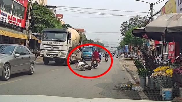 Ngay lúc đó, phía làn đối diện xuất hiện một chiếc xe bồn đi đến. Tài xế xe bồn cũng đã kịp phanh lại, người phụ nữ ngã ra đường khi chỉ cách bánh xe bồn chừng 10cm.