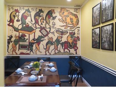 Điều đặc biệt là những phòng ăn này gợi nhớ tới rất nhiều nét đặc trưng miền Bắc, là tường vẽ tranh Đông Hồ đám cưới chuột, những bức ảnh đen trắng tàu điện, Hàng Buồm khiến thực khách ngỡ như mình đang ở Hà Nội.