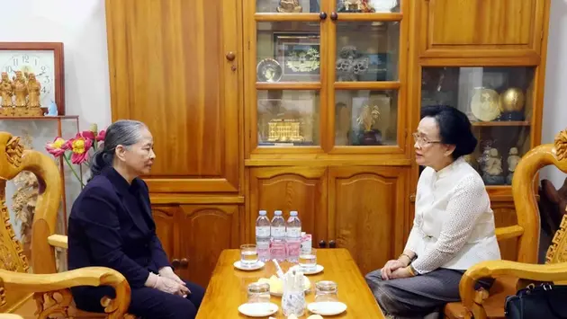 Cảm ơn Phu nhân Naly Sisoulith đã dành thời gian thăm hỏi, Phu nhân Ngô Thị Mận bày tỏ xúc động trước những tình cảm tốt đẹp, chân tình của Phu nhân Naly Sisoulith; chia sẻ về những kỷ niệm khi Tổng Bí thư Nguyễn Phú Trọng còn sống.