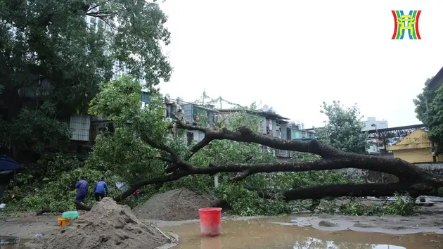Trưa 29/8, nhiều cây xanh ở quận Thanh Xuân, Hà Nội, bị bật gốc, gãy cành sau cơn dông gió mạnh, mưa lớn.