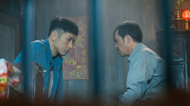 First look của ‘Làm giàu với ma’ hé lộ hình ảnh Lanh (do Tuấn Trần thủ vai) và ông Đạo (do NSƯT Hoài Linh đóng) ngồi mặt đối mặt trên bàn vô cùng căng thẳng. Lanh liếc nhìn cha tỏ vẻ hờn trách nhưng rồi lại vội quay đi, không dám nhìn thẳng.