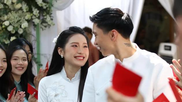 Hai nhân vật chính xuất hiện trong sự trầm trồ của quan viên hai họ. Chàng là tuyển thủ quốc gia nổi tiếng và đẹp trai, trong khi nàng là Top 10 Hoa hậu Việt Nam 2020. Doãn Hải My trang điểm đơn giản, mặc áo dài dân tộc cùng tông màu với Văn Hậu với họa tiết truyền thống, mang ý nghĩa như lời chúc hạnh phúc đến đôi vợ chồng trẻ. Người đẹp sinh năm 2001 xinh đẹp rạng ngời, luôn nở nụ cười hạnh phúc sánh bước cùng chồng.