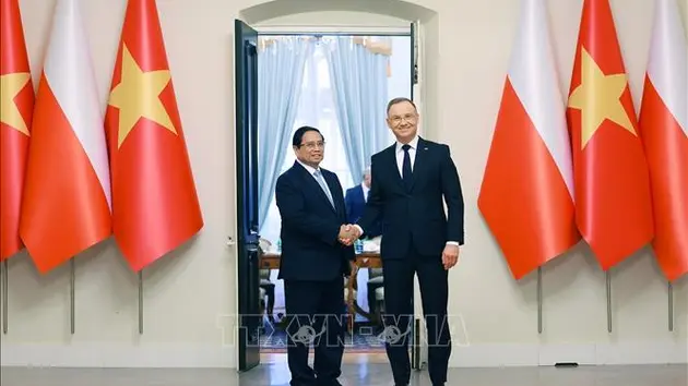 Thủ tướng Phạm Minh Chính trân trọng chuyển lời thăm hỏi của Tống Bí thư Tô Lâm, Chủ tịch nước Lương Cường, Chủ tịch Quốc hội Trần Thanh Mẫn tới Tổng thống Andrzej Duda. Thủ tướng cảm ơn sự tiếp đón chân tình, trọng thị của các nhà lãnh đạo và nhân dân Ba Lan dành cho Đoàn và thông báo kết quả của cuộc hội đàm rất thành công với Thủ tướng Donald Tusk; nhấn mạnh nhân dân Việt Nam luôn ghi nhớ sự ủng hộ và hỗ trợ quý báu của nhân dân Ba Lan đã dành cho Việt Nam trong cuộc đấu tranh giành độc lập, thống nhất đất nước trước đây và công cuộc phát triển kinh tế - xã hội, hội nhập quốc tế ngày nay.