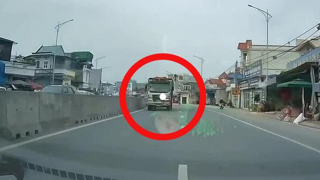 Camera trên một ô tô con bất ngờ ghi được hình ảnh chiếc xe tải mang biển kiểm soát Hải Phòng đi ngược chiều sát dải phân cách cứng trên quốc lộ 10.