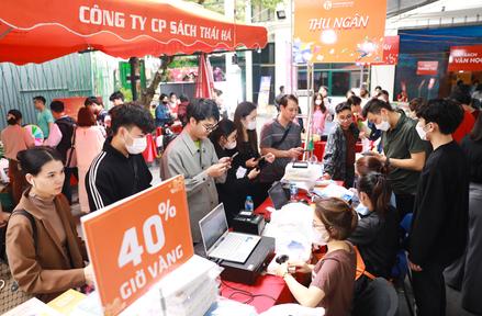 Với hơn 10.000 đầu sách mang nội dung phong phú, chương trình "Hội sách tháng 4 - Truyền cảm hứng đọc" do Công ty CP Sách Thái Hà (Thái Hà Books) phối hợp với Công ty TNHH Thương mại và Dịch vụ văn hóa Đinh Tị (Đinh Tị Books) tổ chức tại Bảo tàng Phụ nữ Việt Nam (36 Lý Thường Kiệt, Hoàn Kiếm, Hà Nội) đã thu hút đông đảo độc giả Thủ đô tìm đến ngay trong ngày đầu diễn ra.Hội sách tháng 4 là hoạt động chào mừng Ngày Sách và Văn hóa đọc Việt Nam lần thứ 2 (21/4/2023) với chủ đề xuyên suốt là "Truyền cảm hứng đọc". Qua đó, lan tỏa văn hóa đọc tới thế hệ trẻ, đặc biệt là các bạn Gen Z.Ngay trong ngày đầu, dù không phải cuối tuần nhưng hội sách đã thu hút rất nhiều độc giả tới tham quan và mua sách. Tại hội sách lần này, để thỏa lòng khách hàng, Thái Hà Books và Đinh Tị Books mang đến hàng loạt ưu đãi như đồng giá sách từ 5.000 - 20.000 đồng/ cuốn; flash sale đến 40% toàn bộ sách trong khung giờ vàng từ 11h - 13h hàng ngày... Theo ghi nhận, hầu hết ai đến hội sách cũng đều lựa chọn được cho mình rất nhiều cuốn sách ưng ý.Nhiều thời điểm, mọi gian hàng đều chật kín khách. Mọi người phải chờ xếp hàng để đến lượt được thanh toán.Với các tựa sách mới vô cùng đa dạng, hội sách thu hút độc giả ở nhiều lứa tuổi khác nhau.Nhiều cuốc sách hay, thiết thực với cuộc sống được giới thiệu tại hội sách. Trong đó, những đầu sách về chủ đề: Phật pháp, cha mẹ, chữa lành... được nhiều bậc phụ huynh lựa chọn.Không ít người tìm được cuốn sách hay còn say mê đọc ngay tại chỗ."Rất nhiều đầu sách tại đây giúp con tôi thích thú. Trước đây, mỗi khi có hội sách tôi đều cố gắng sắp xếp thời gian để đưa cháu đi, chỉ mong cháu được tiếp cận văn hóa đọc và yêu thích sách từ bé", chị Phạm Thị Hạnh Nguyên (Long Biên, Hà Nội) chia sẻ.Với mục tiêu đặt khán giả nhí làm trung tâm của sự sáng tạo, hội sách năm nay không chỉ mở ra không gian sách rộng lớn mà còn có nhiều chương trình vui chơi thu hút các bạn nhỏ."Hội sách tháng 4 - Truyền cảm hứng đọc" hướng tới lan tỏa năng lượng tích cực và truyền cảm hứng tới thế hệ trẻ. Hội sách sẽ kéo dài đến hết ngày 16/4, tại Bảo tàng Phụ nữ Việt Nam.